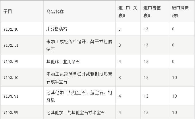 根據2019年4月1日起實施的增值稅降稅政策及《進出口稅則對照使用手冊(2019版)》,寶石進口時應繳納關稅、增值稅和消費稅,稅率分別為: